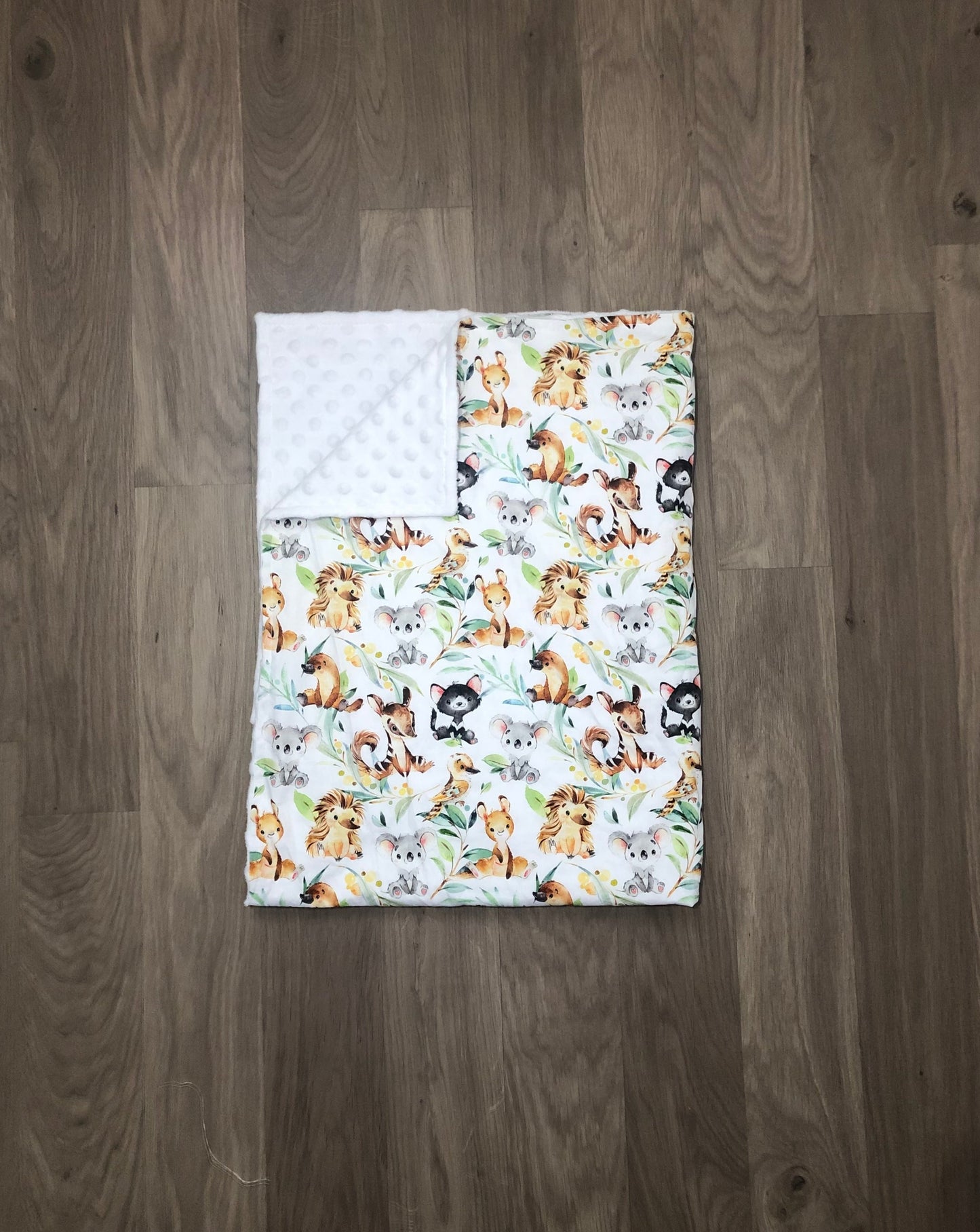 Our pram blankets are handmade with beautiful cotton fabric on the front with a soft minky on the back.