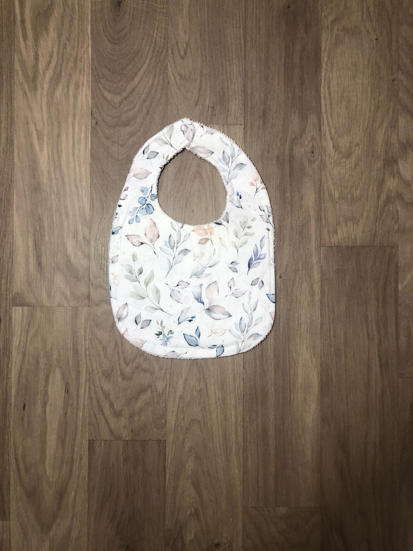 Our beautiful bibs and burp cloths are handmade with cotton on the front and absorbent toweling on the back.