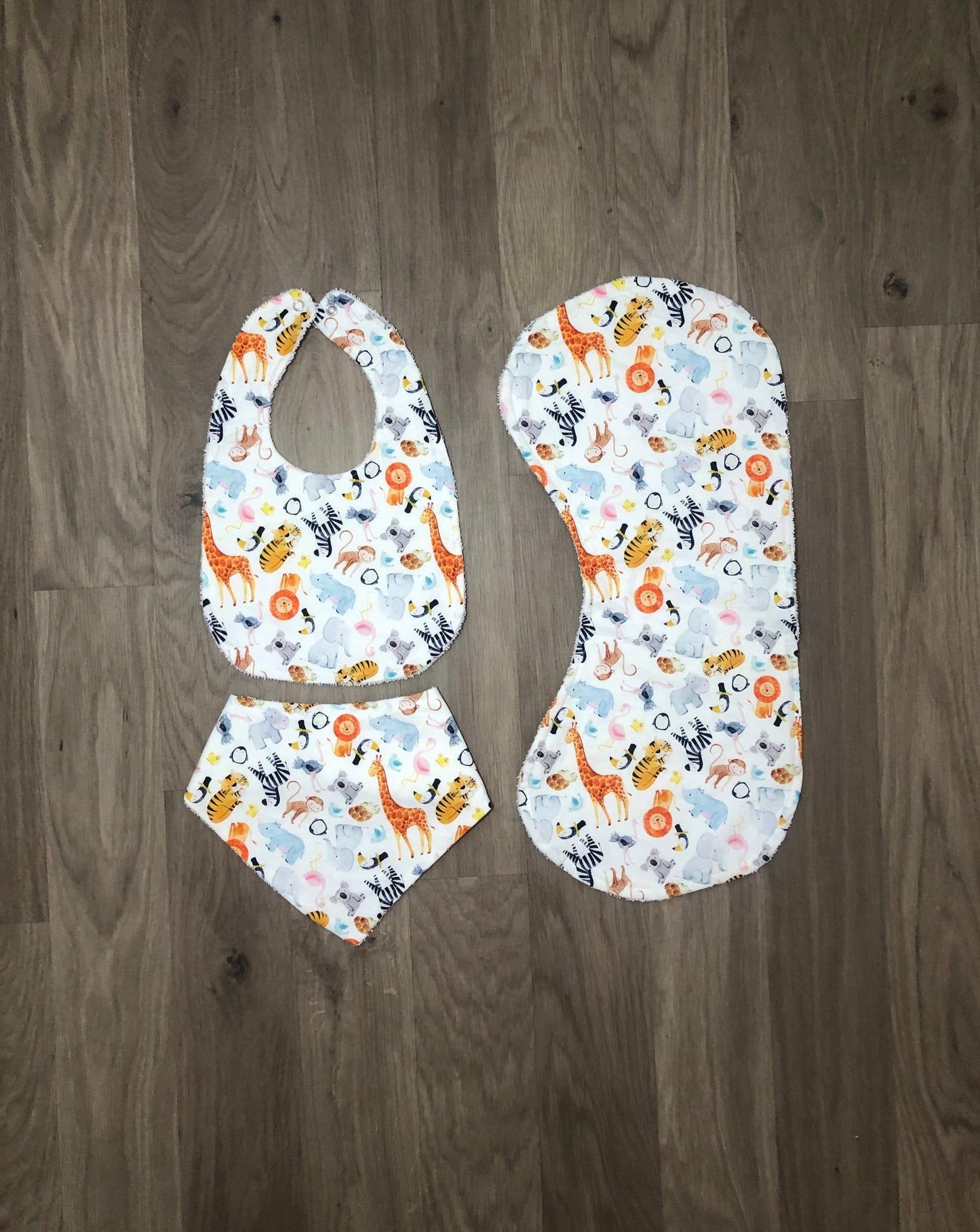 Our beautiful bibs and burp cloths are handmade with cotton on the front and absorbent toweling on the back.