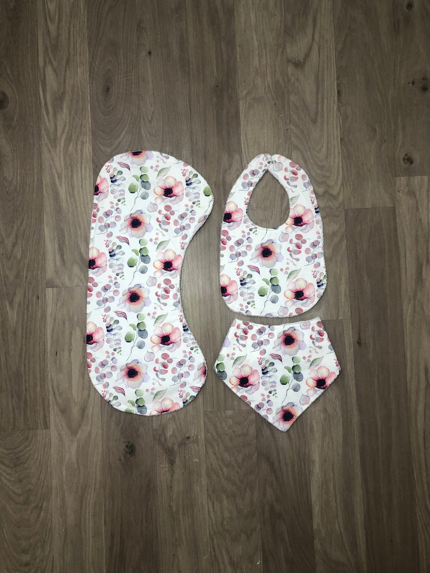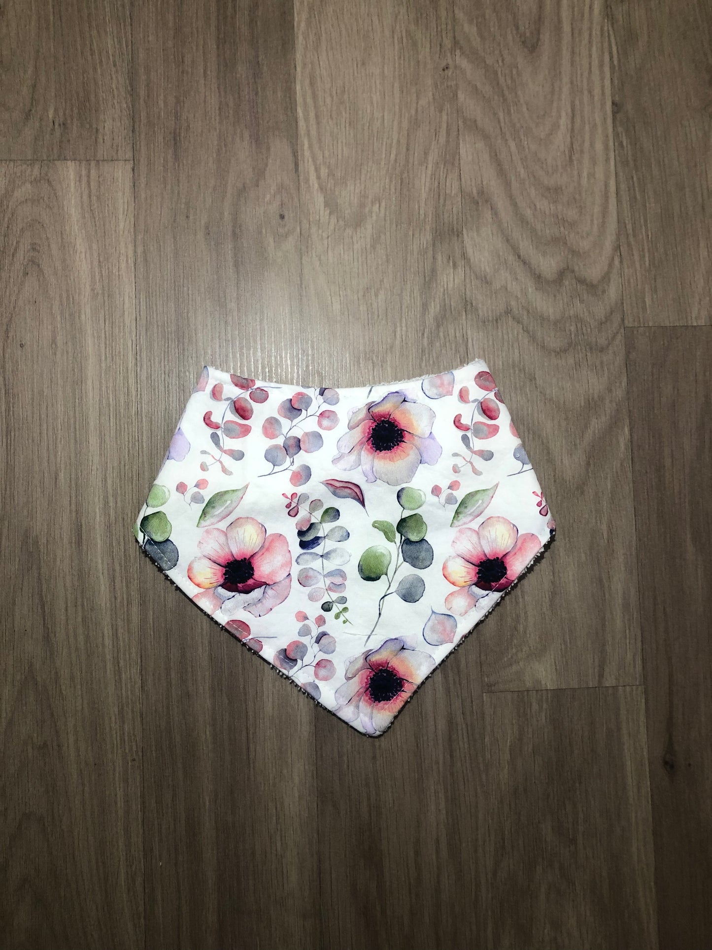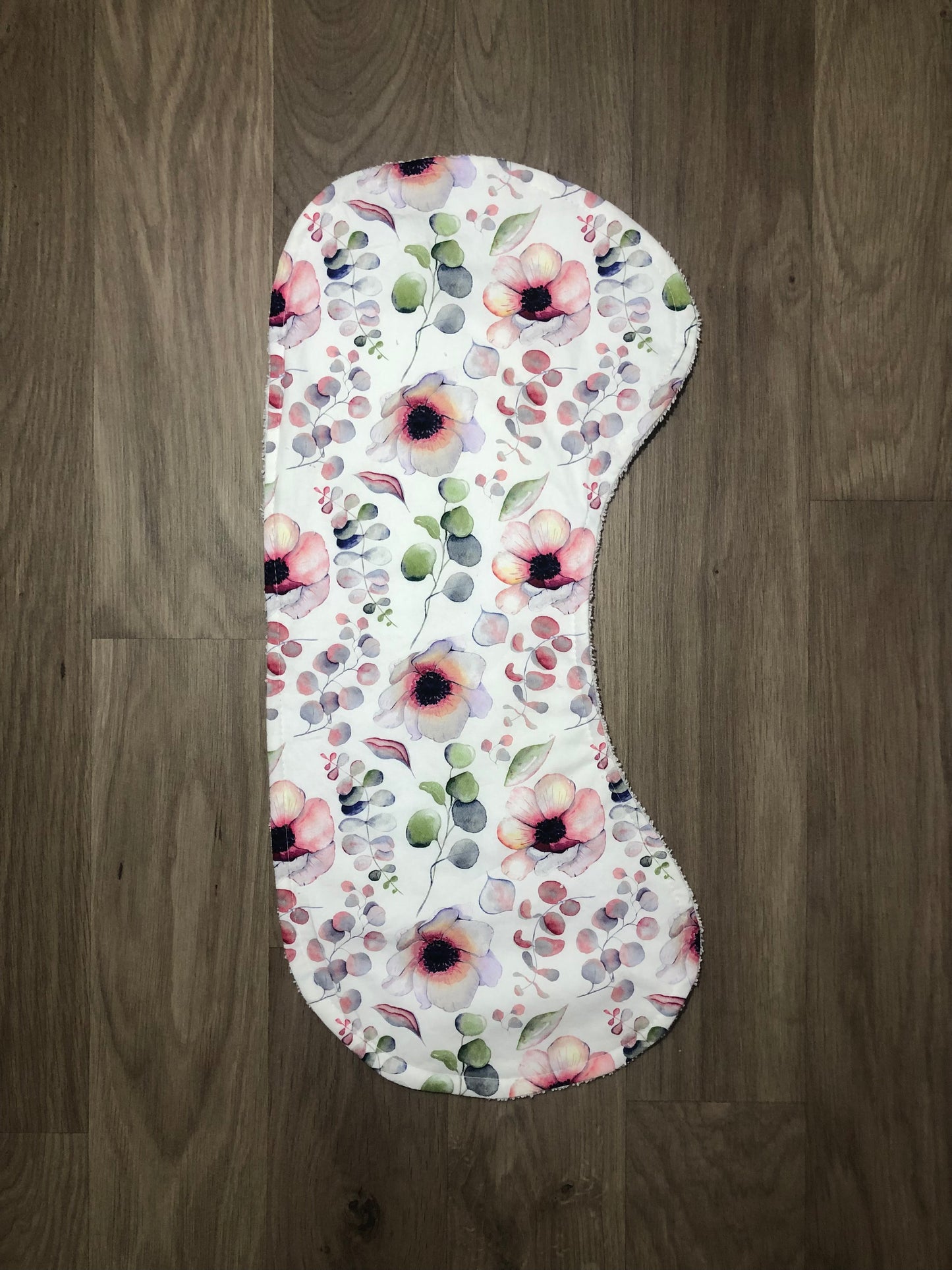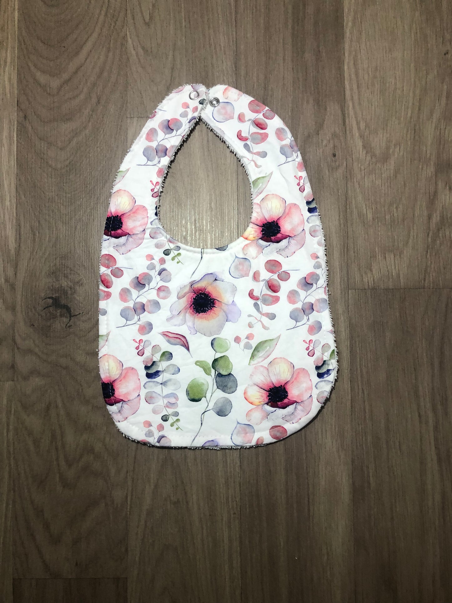 Our beautiful bibs and burp cloths are handmade with cotton on the front and absorbent toweling on the back.
