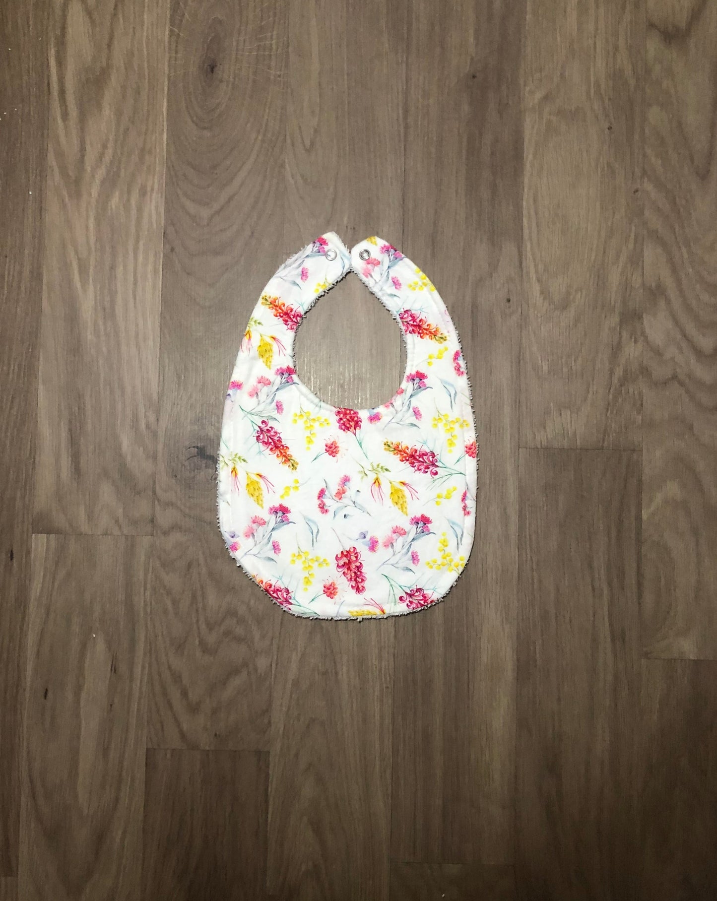 These beautiful bibs are handmade with cotton on the front and absorbent toweling on the back.