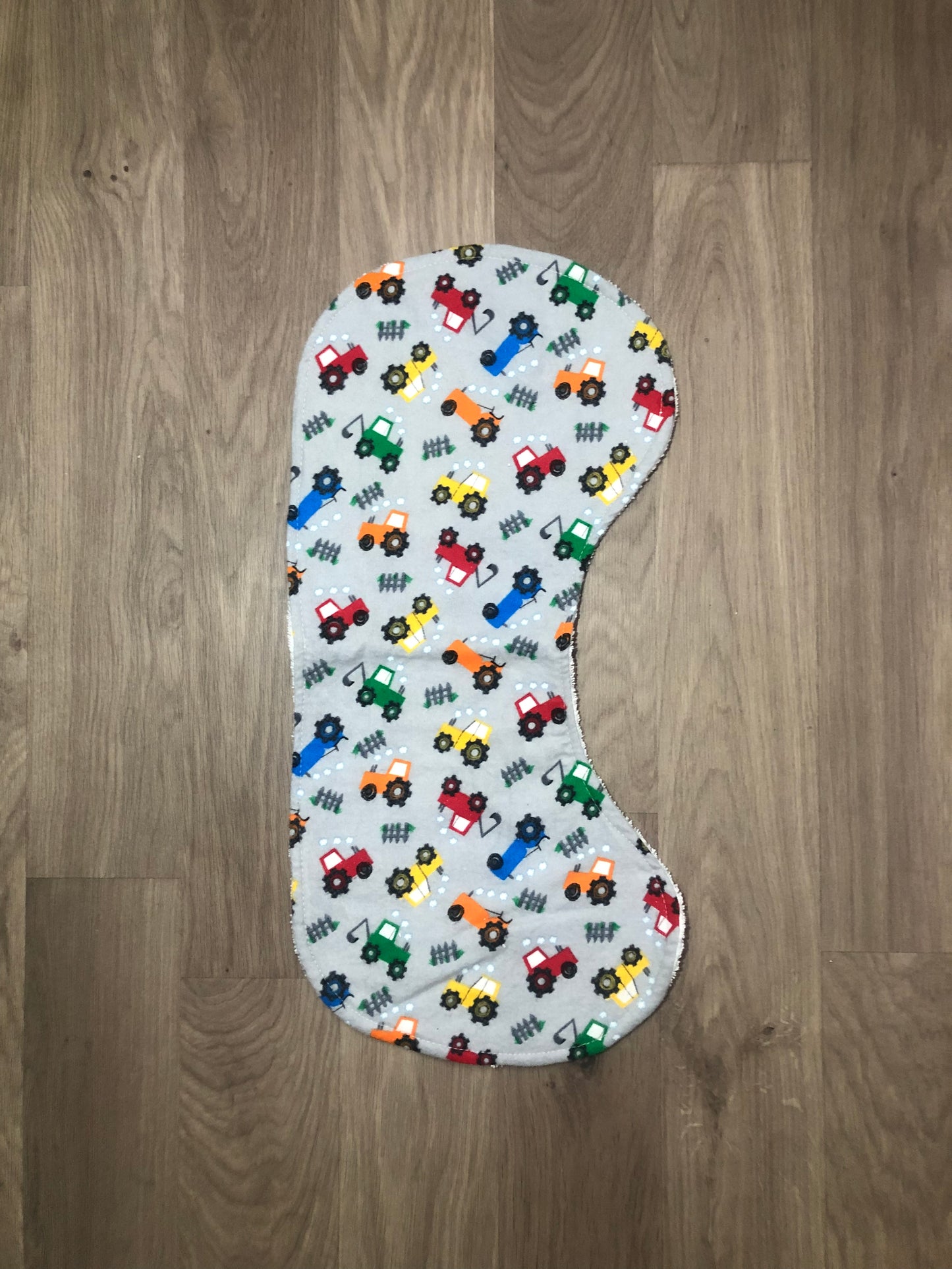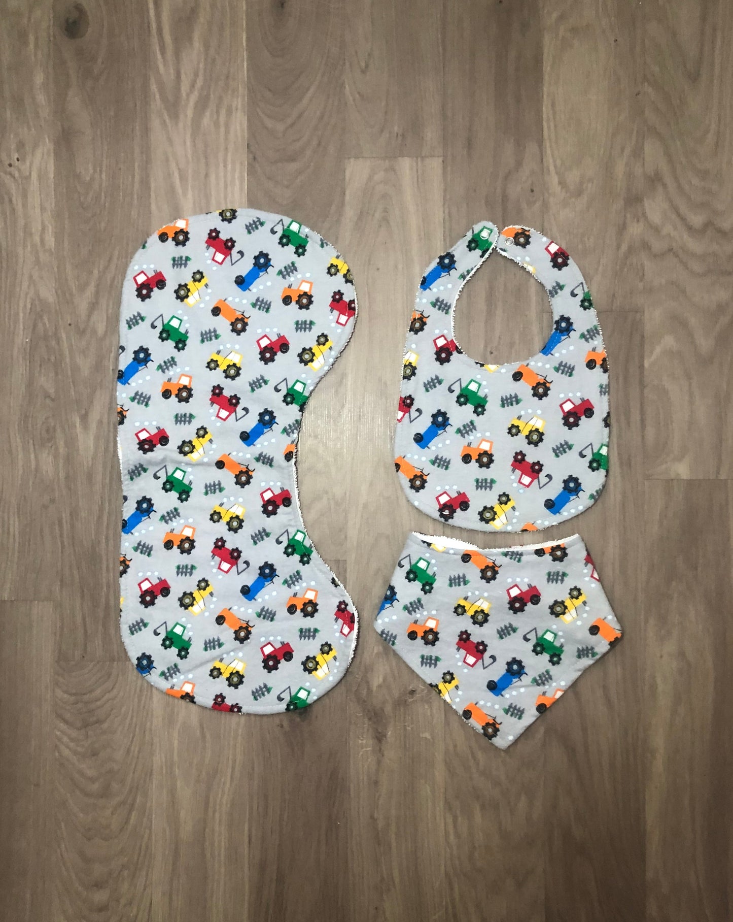 These beautiful bibs and burp cloths are handmade with flannelette on the front and absorbent toweling on the back.