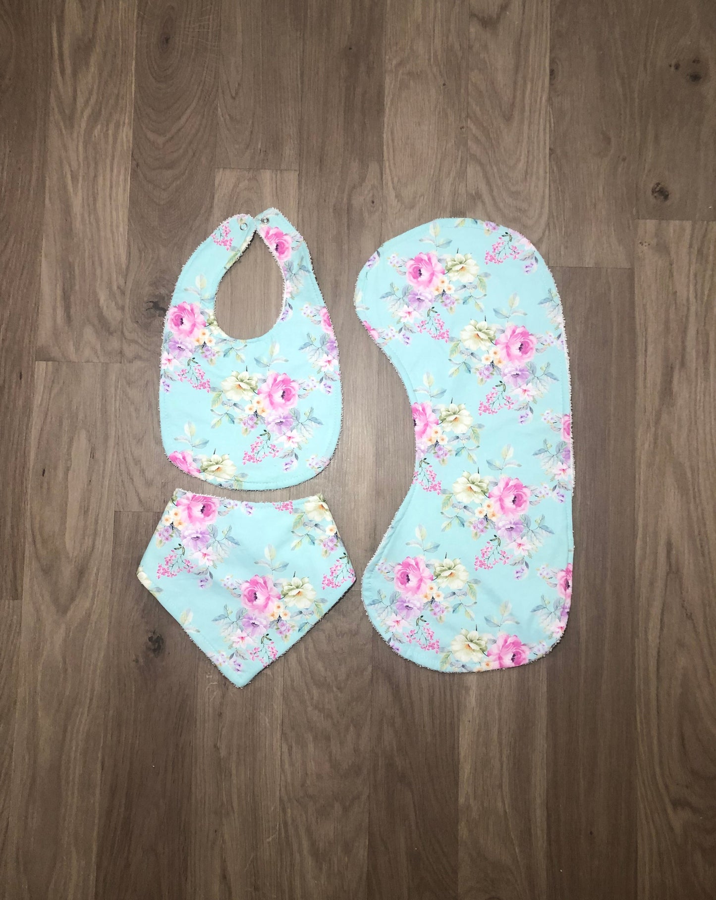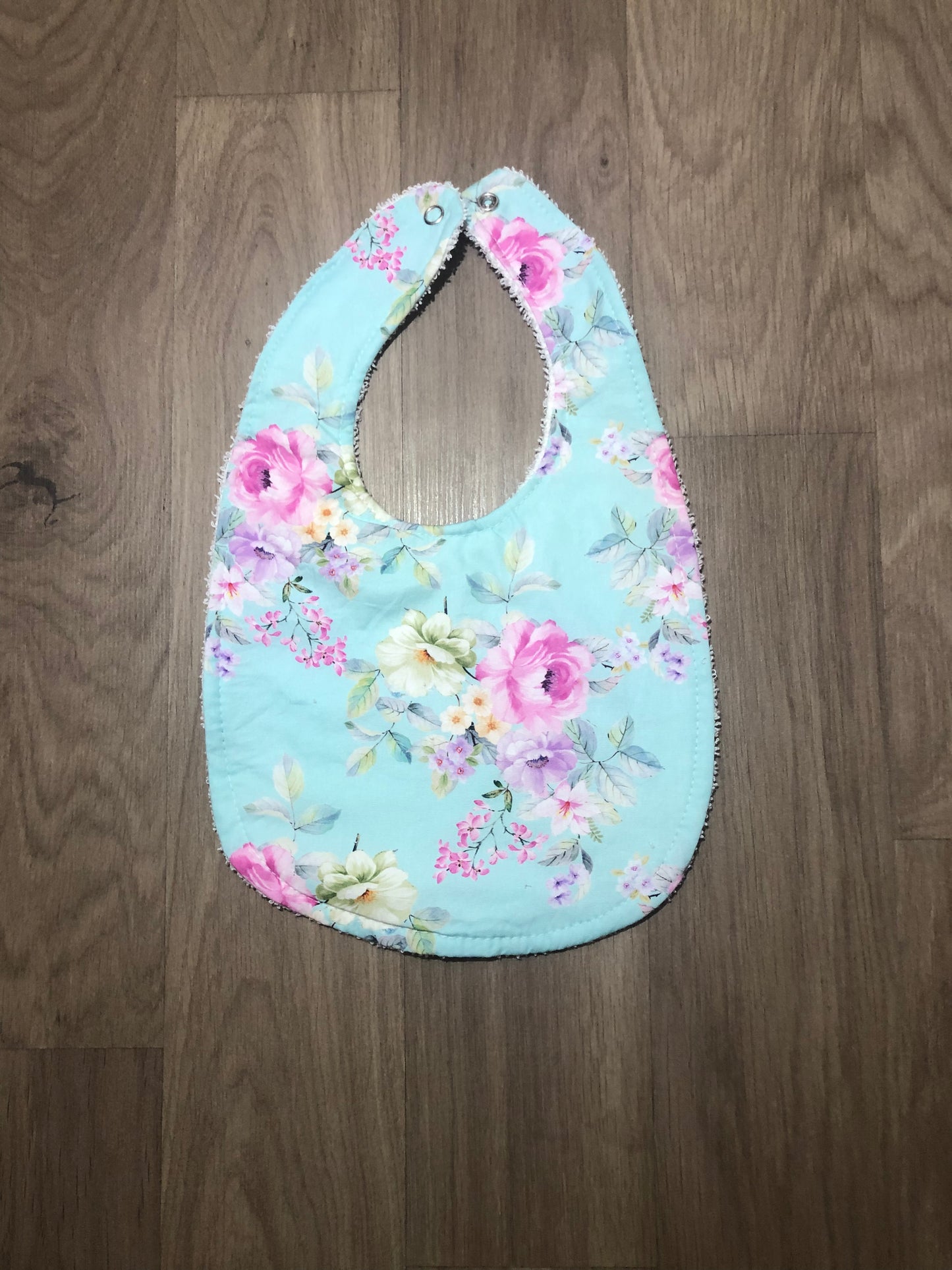 Our beautiful bibs and burp cloths are handmade with cotton on the front and absorbent toweling on the back.