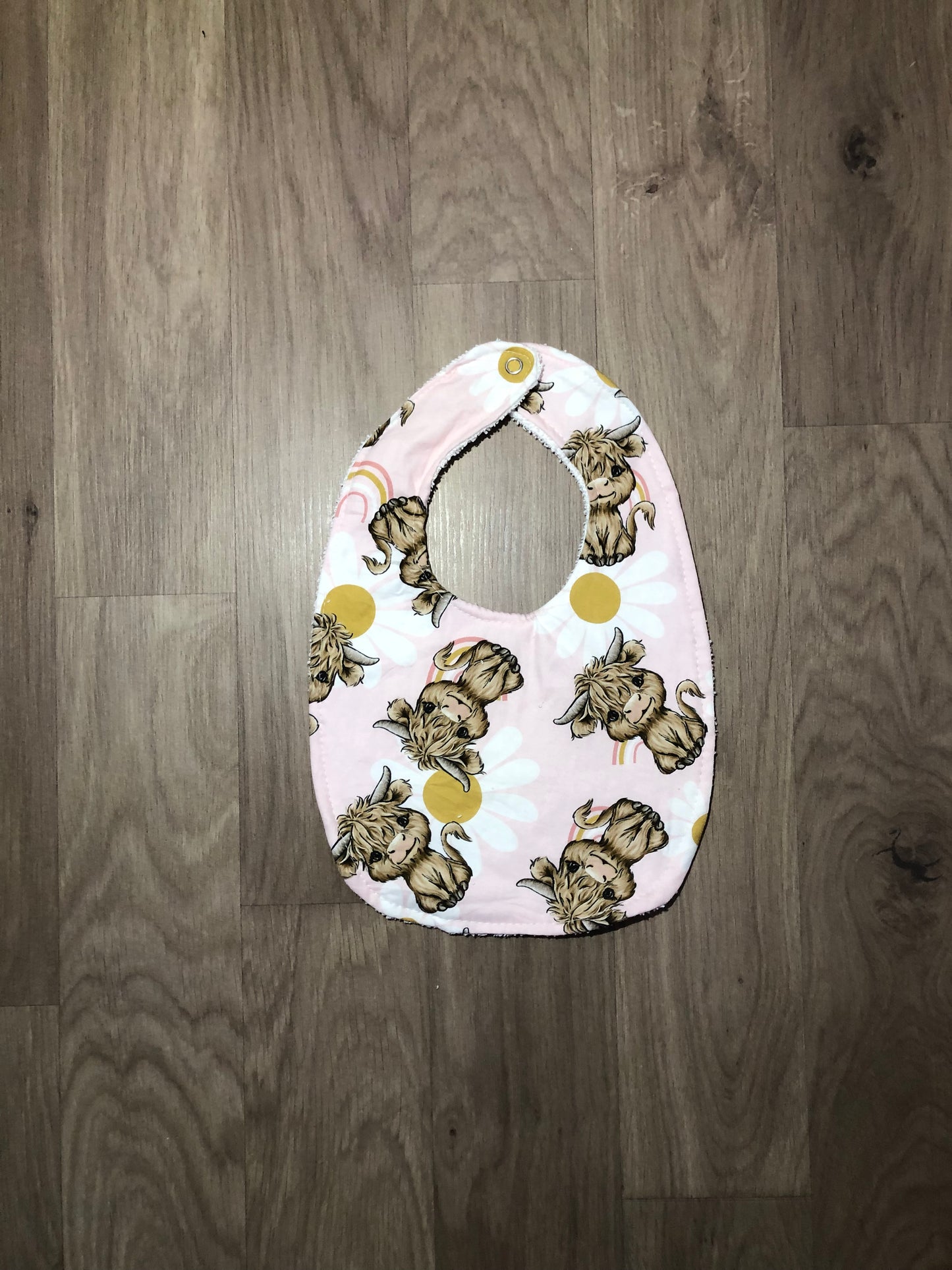 These beautiful bibs are handmade with cotton on the front and absorbent toweling on the back.