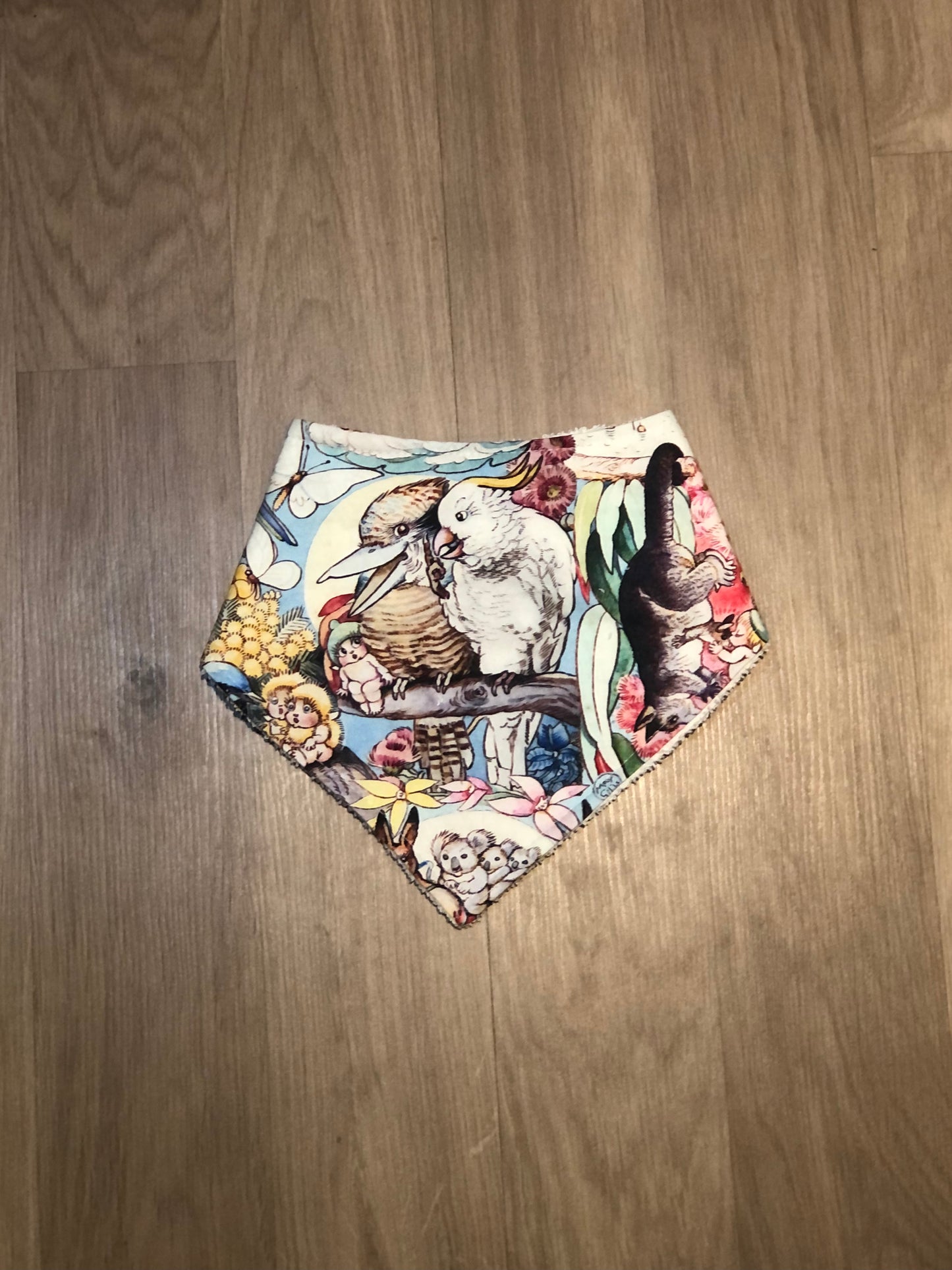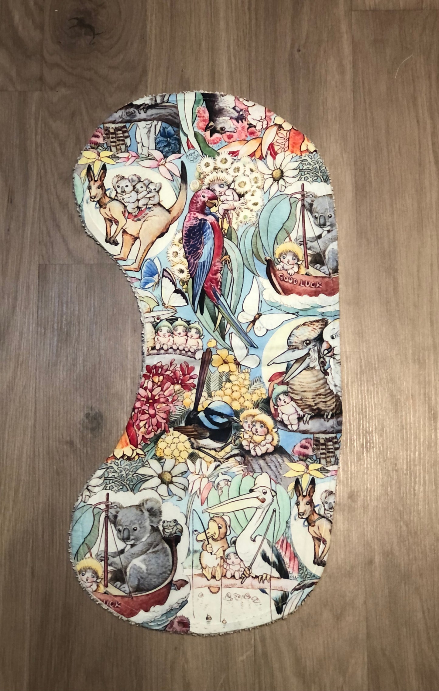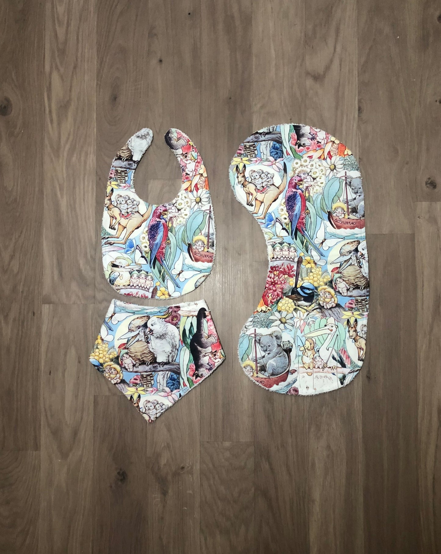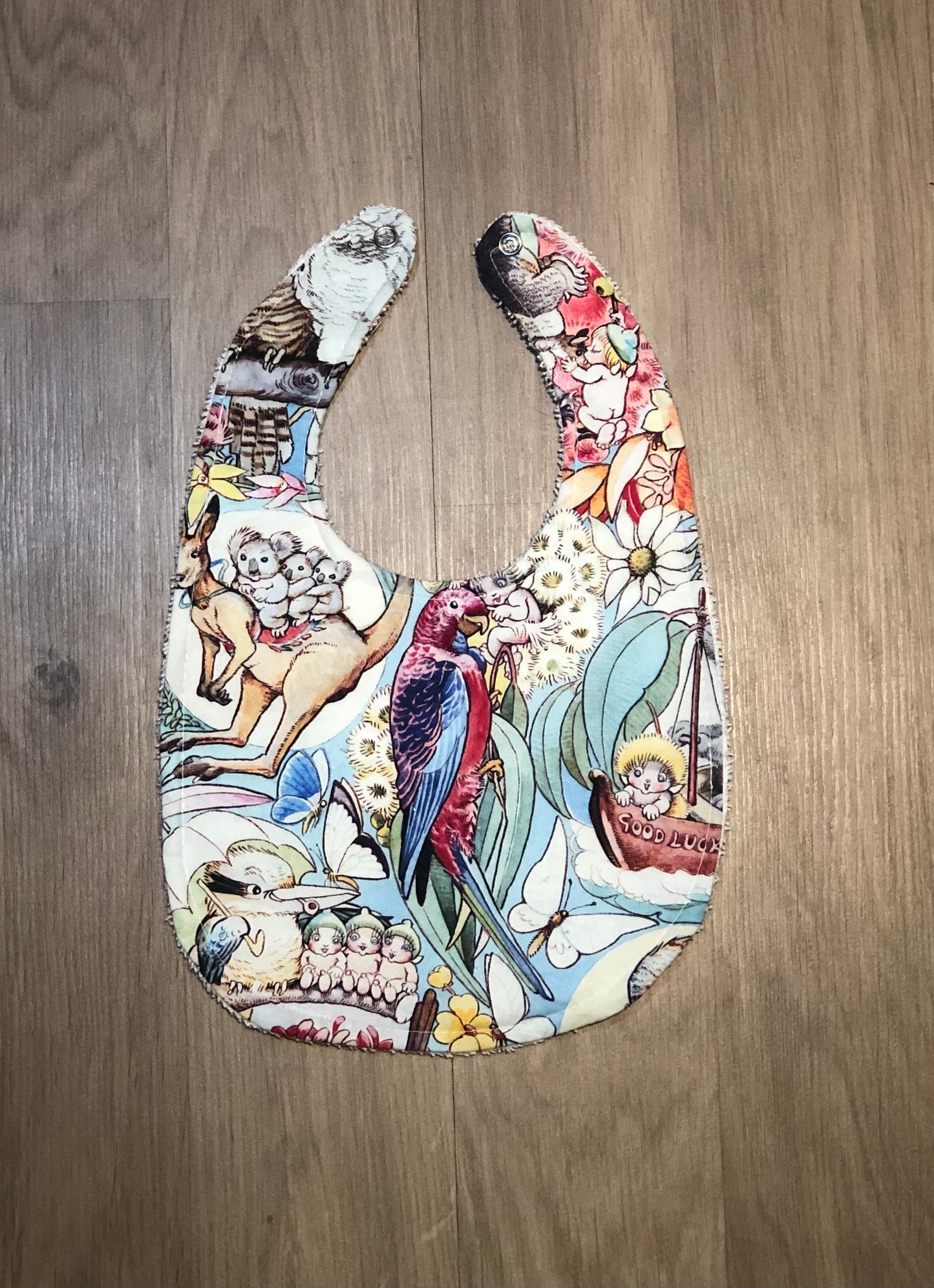 Our beautiful bibs and burp cloths are handmade with cotton on the front and absorbent toweling on the back.