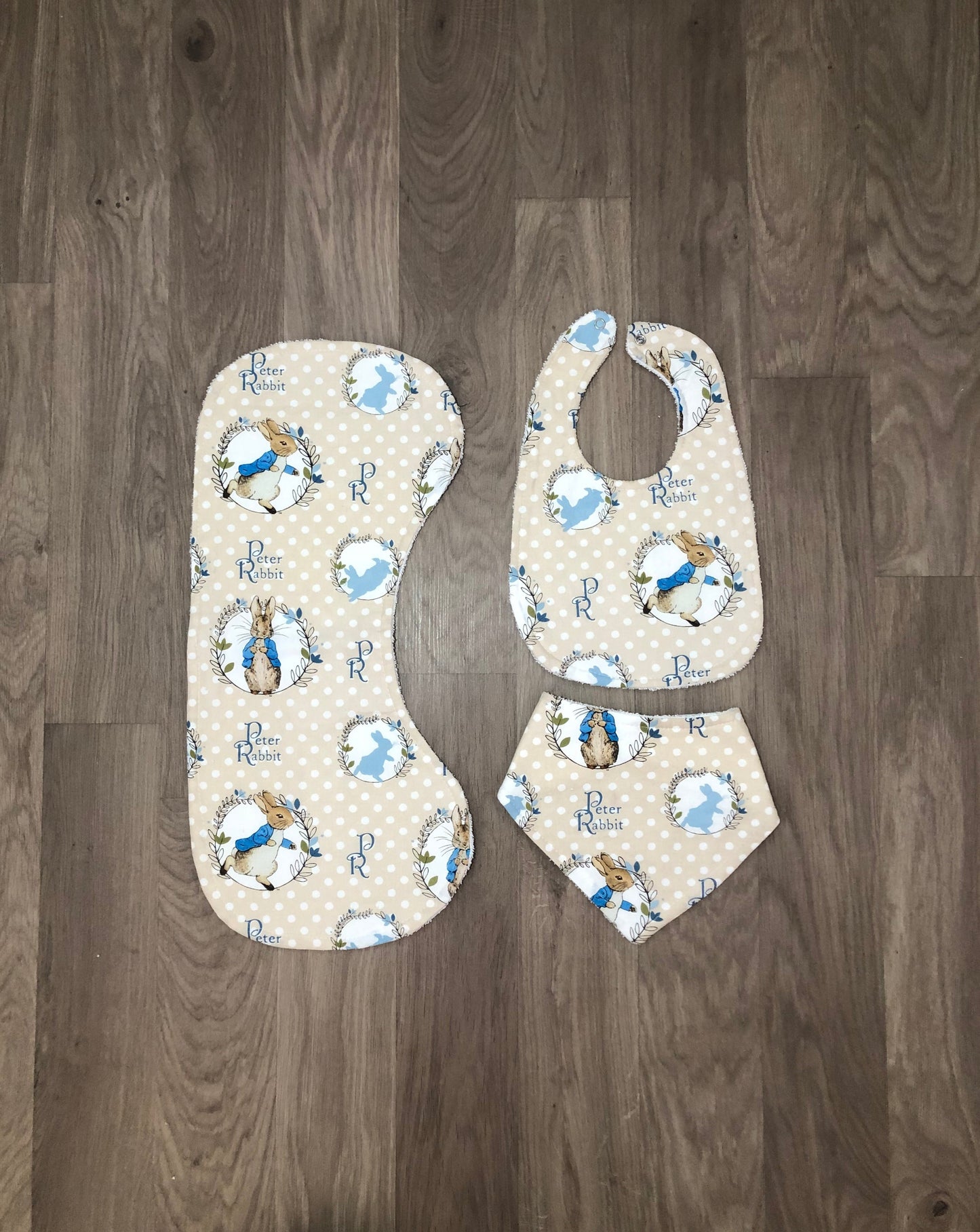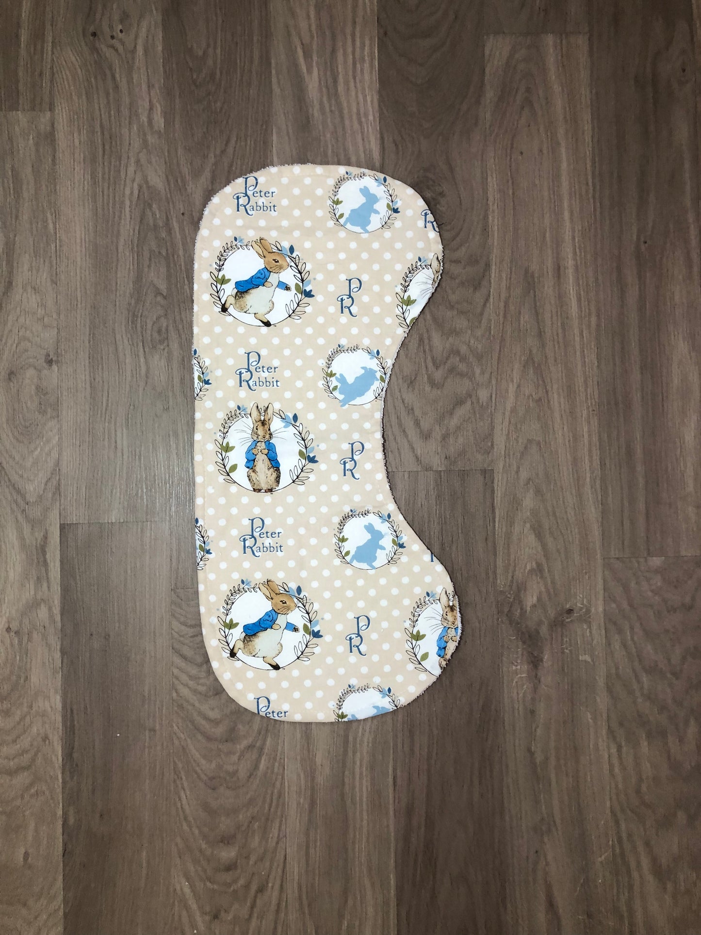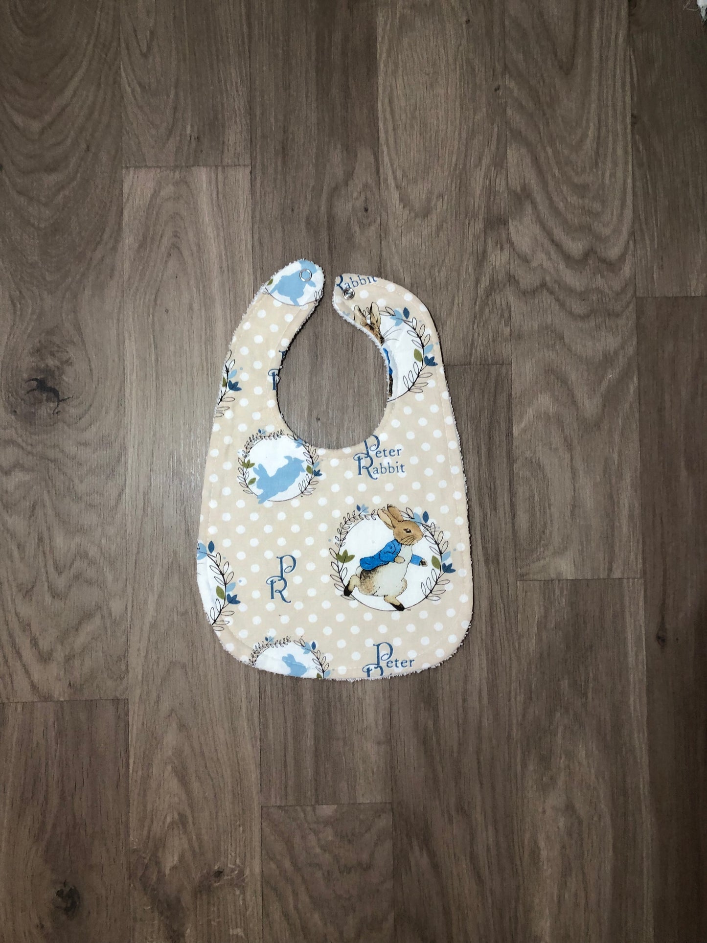 Our beautiful bibs and burp cloths are handmade with cotton on the front and absorbent toweling on the back.