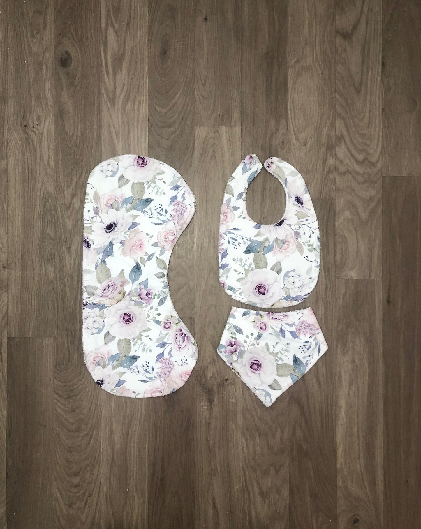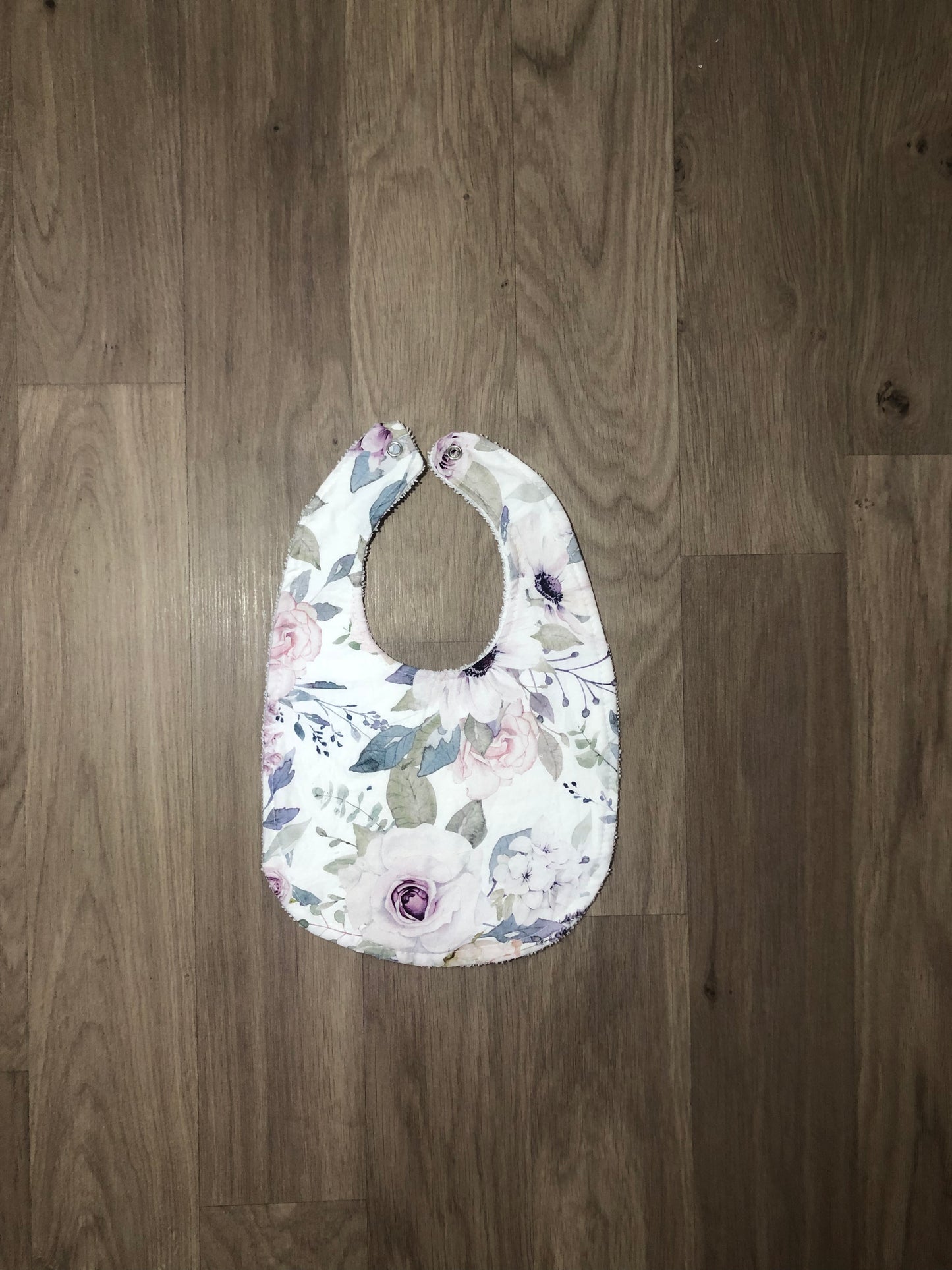 Our beautiful bibs and burp cloths are handmade with cotton on the front and absorbent toweling on the back.