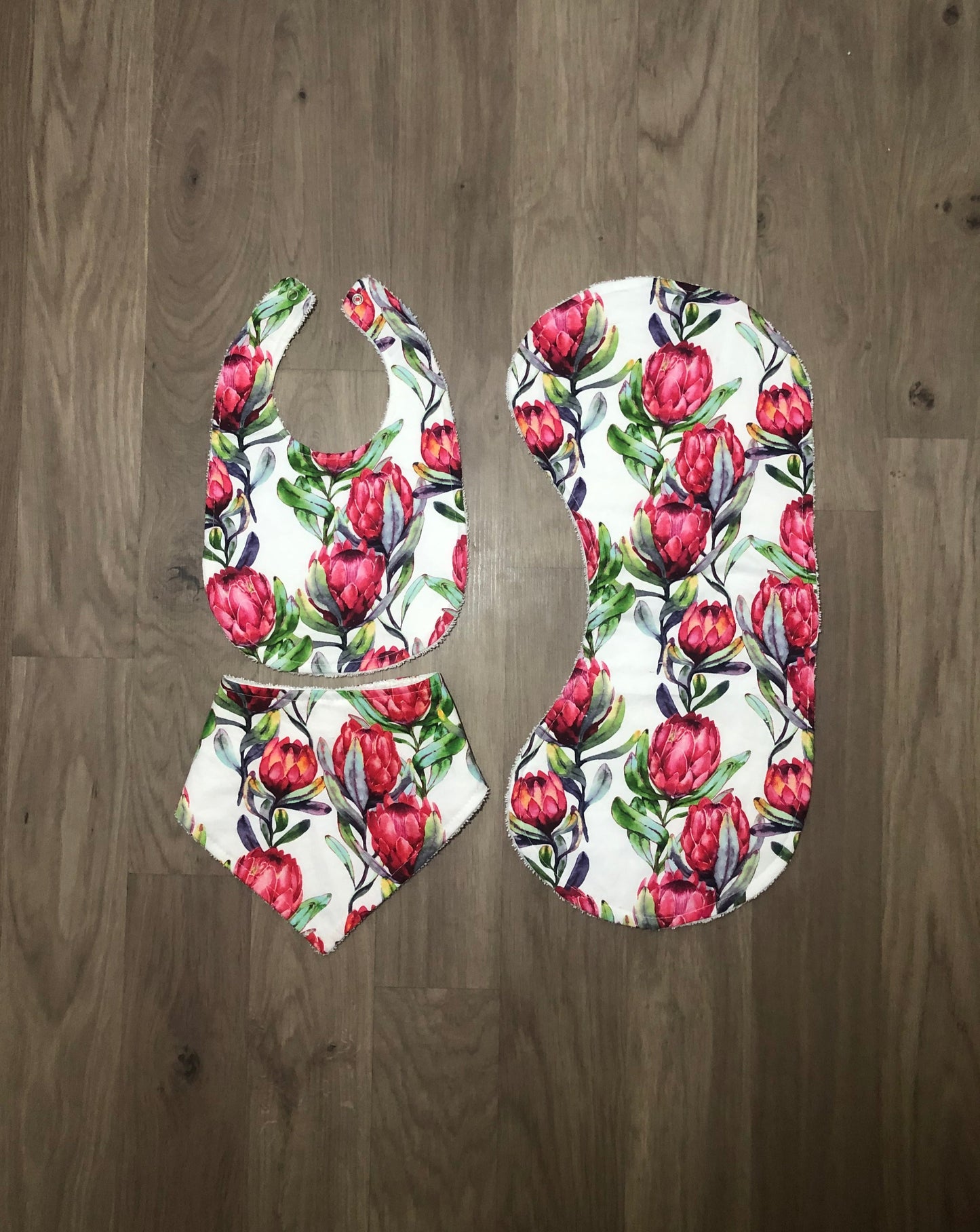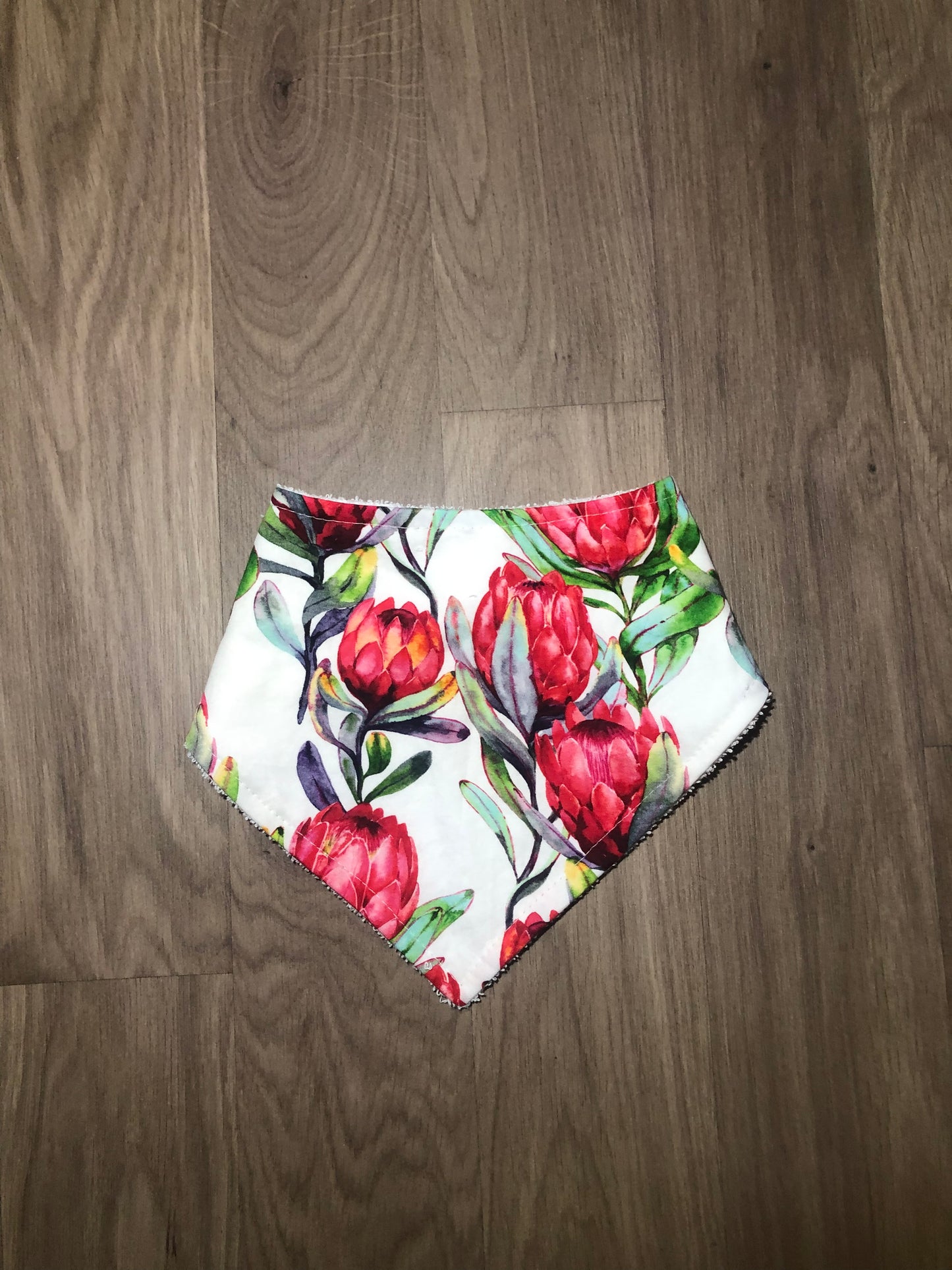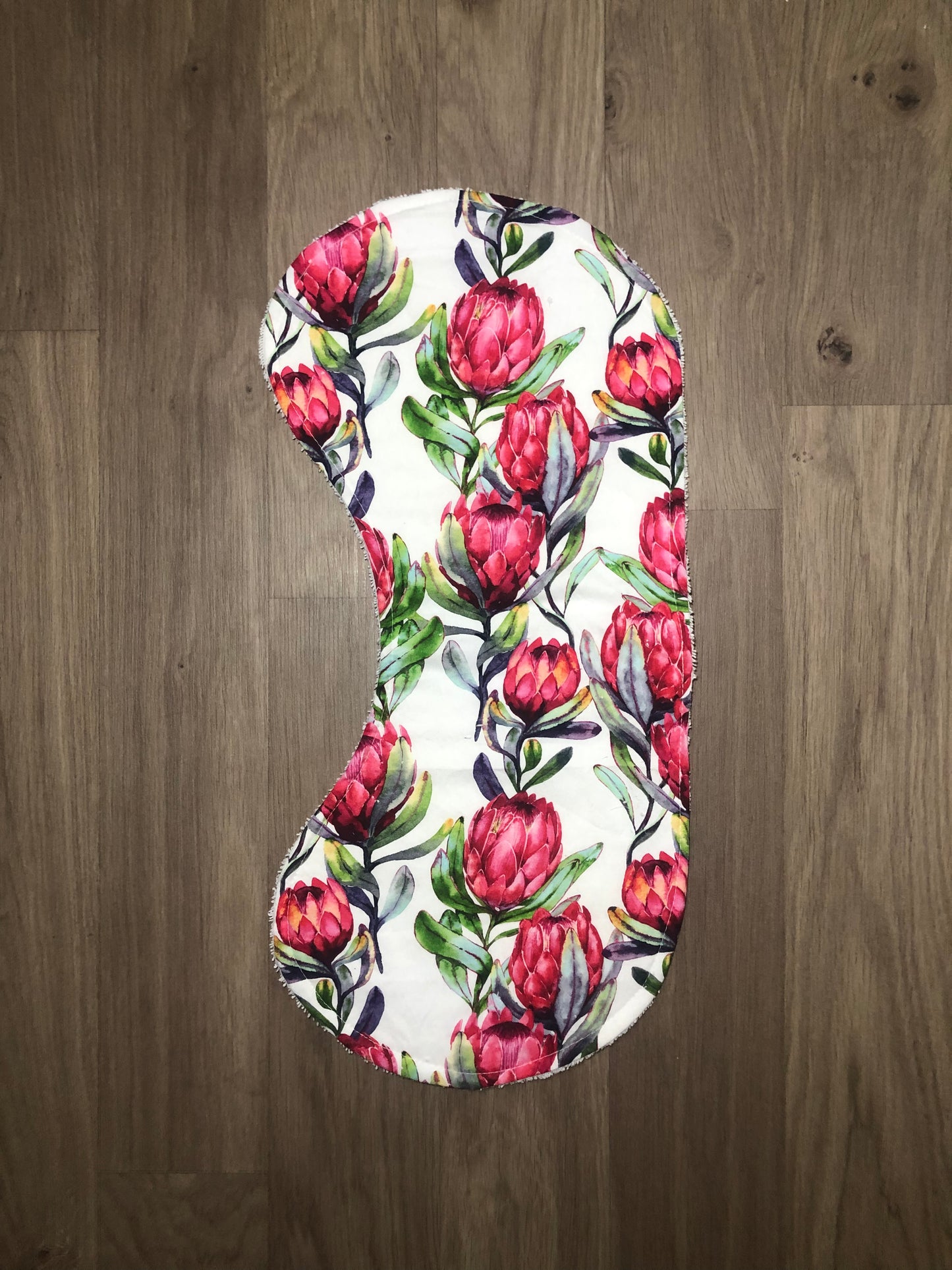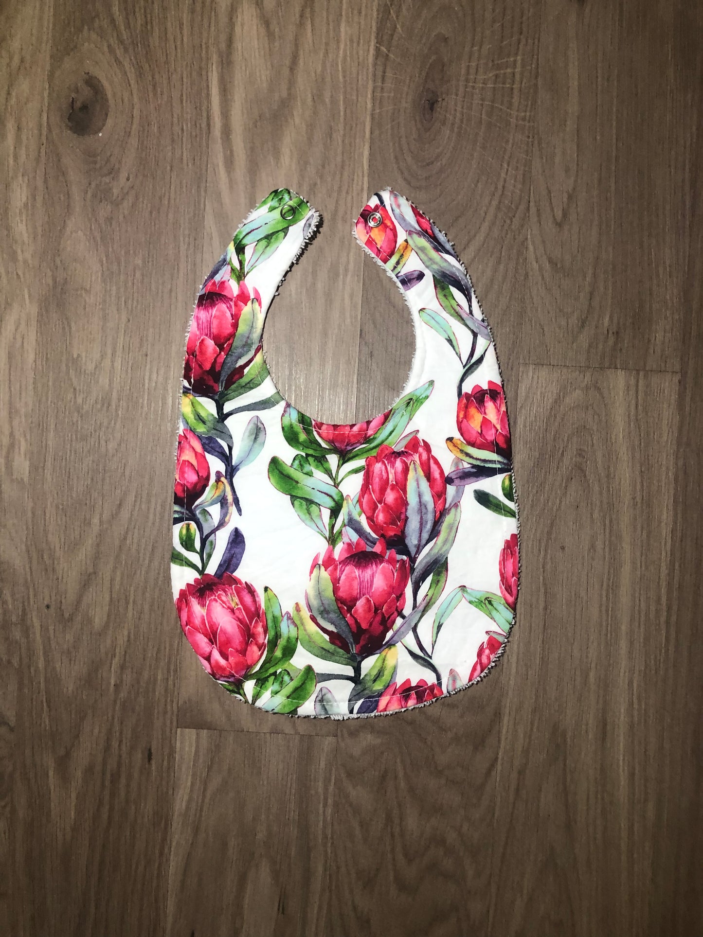 Our beautiful bibs and burp cloths are handmade with cotton on the front and absorbent toweling on the back.