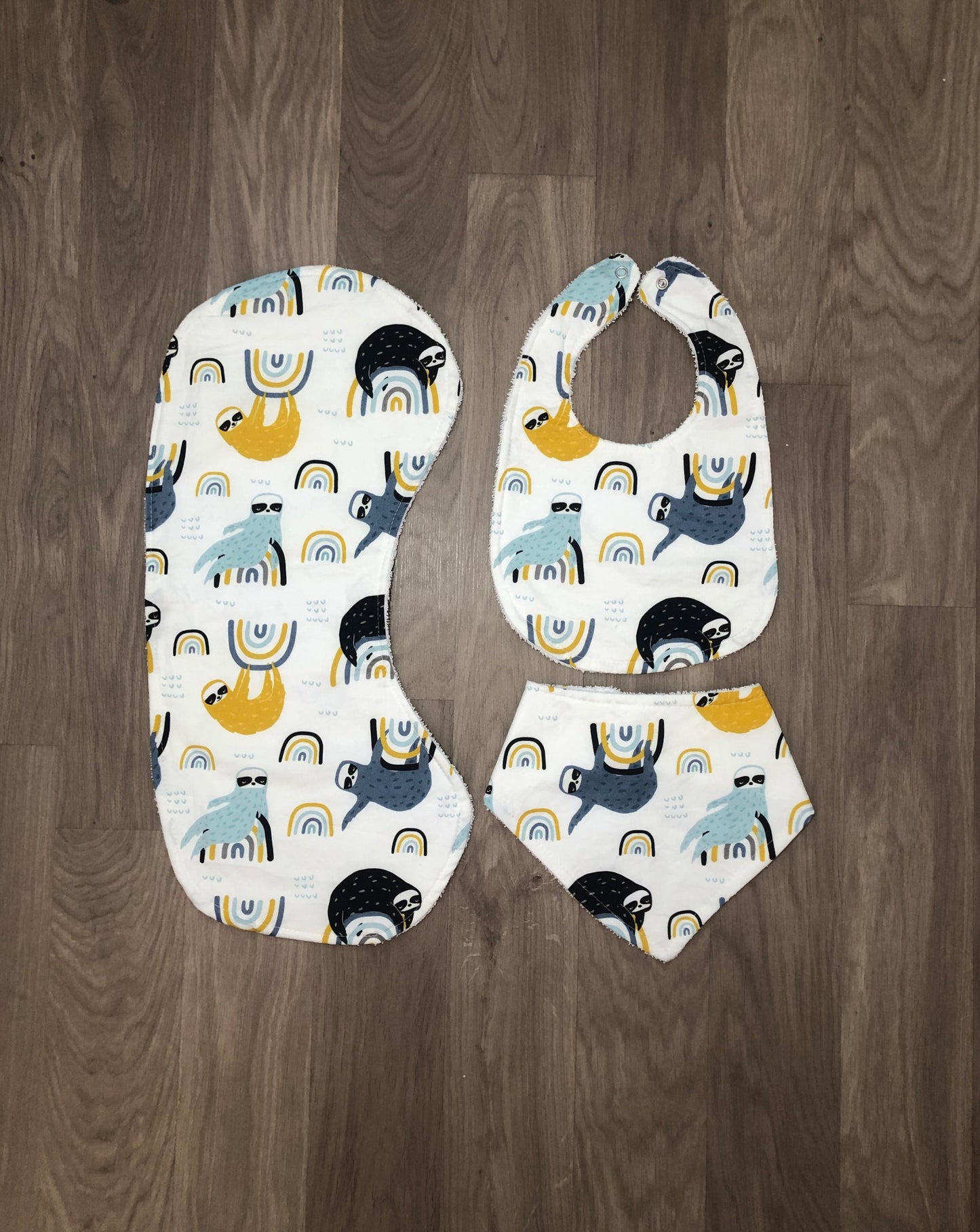 Our beautiful bibs and burp cloths are handmade with cotton on the front and absorbent toweling on the back.