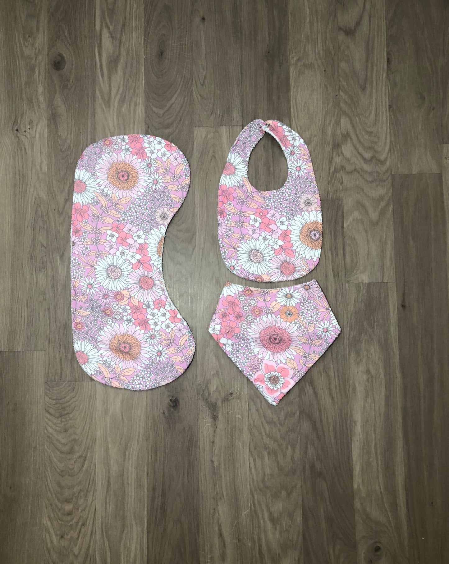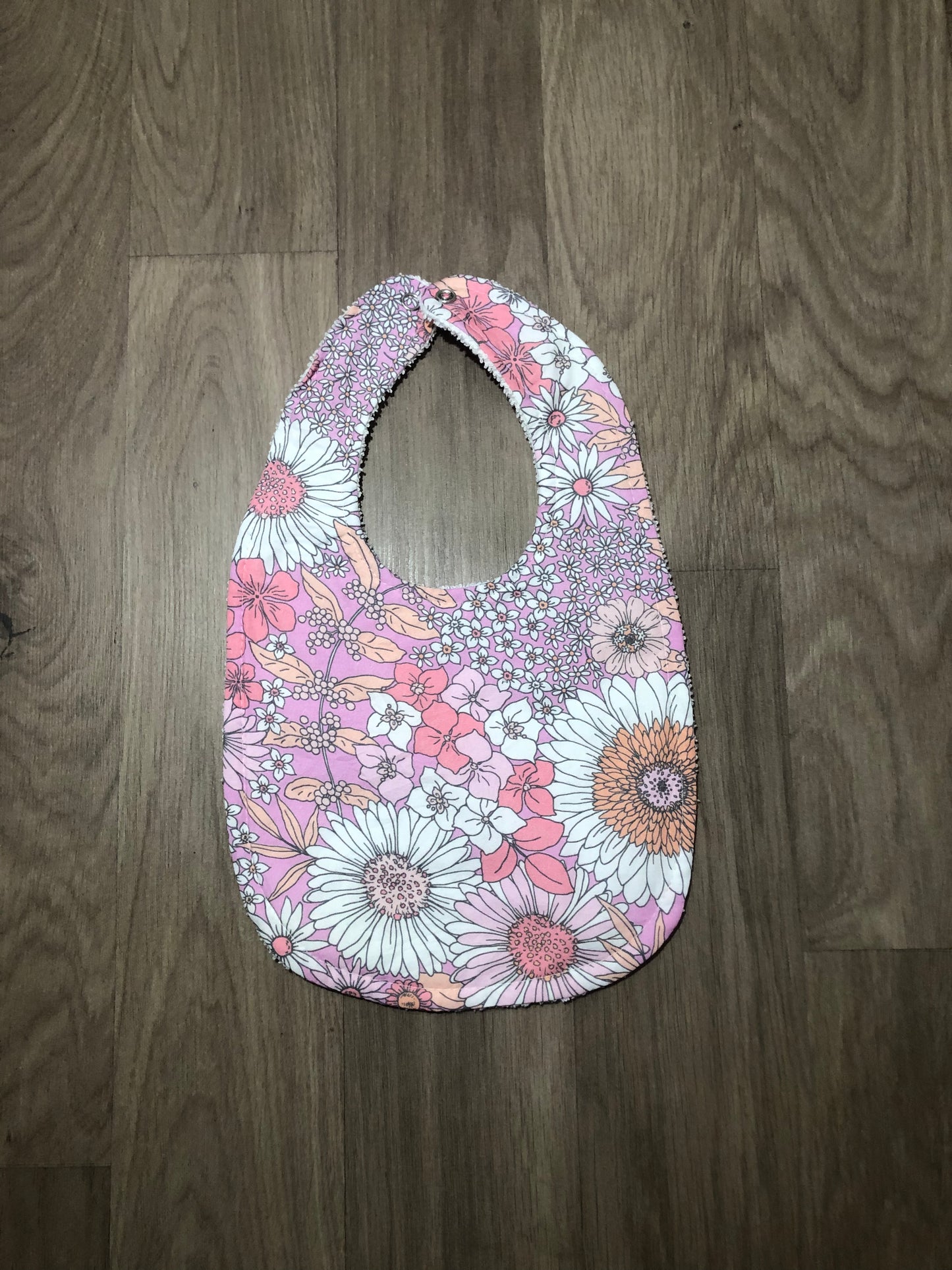 Our beautiful bibs and burp cloths are handmade with cotton on the front and absorbent toweling on the back.