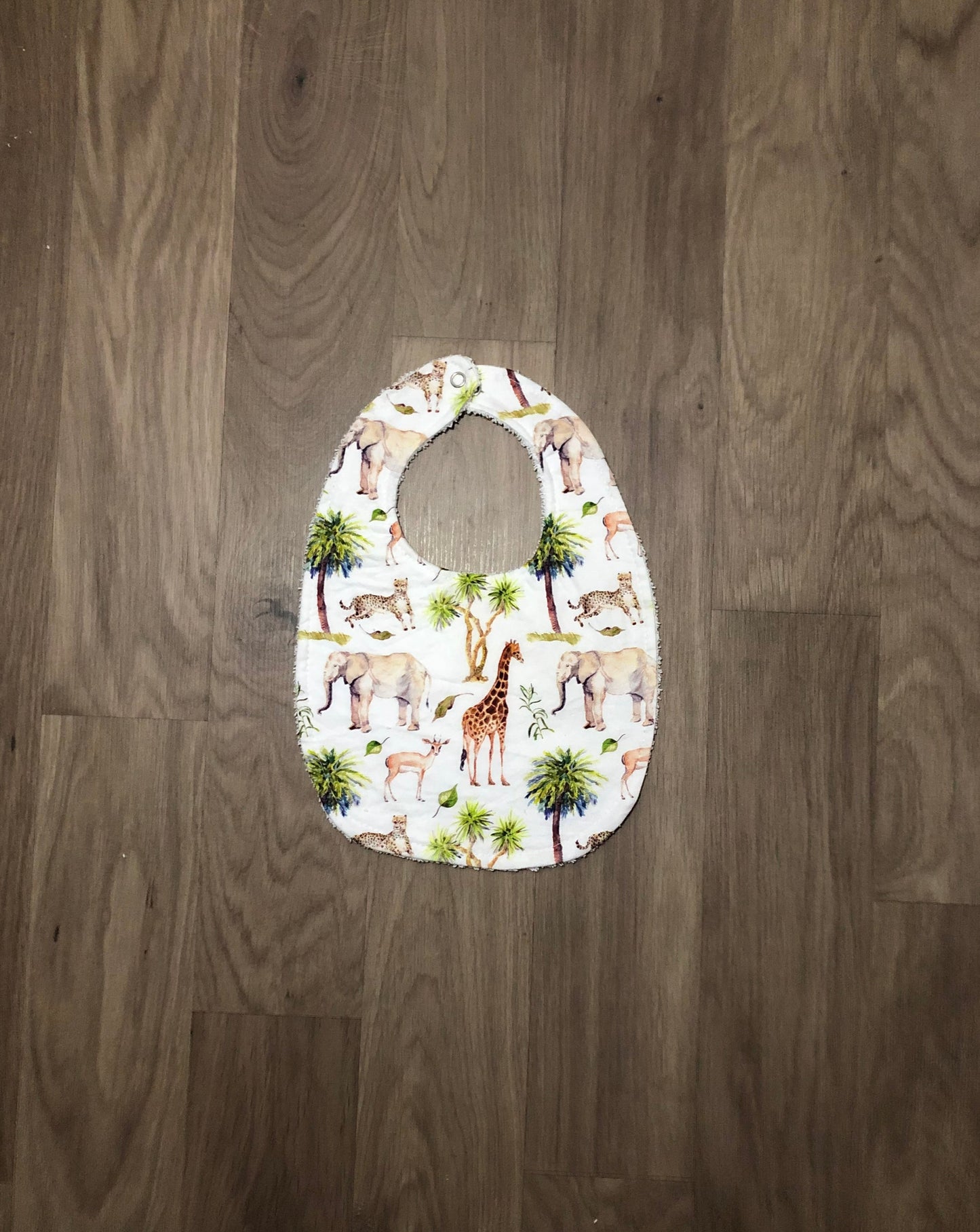 These beautiful bibs are handmade with cotton on the front and absorbent toweling on the back.