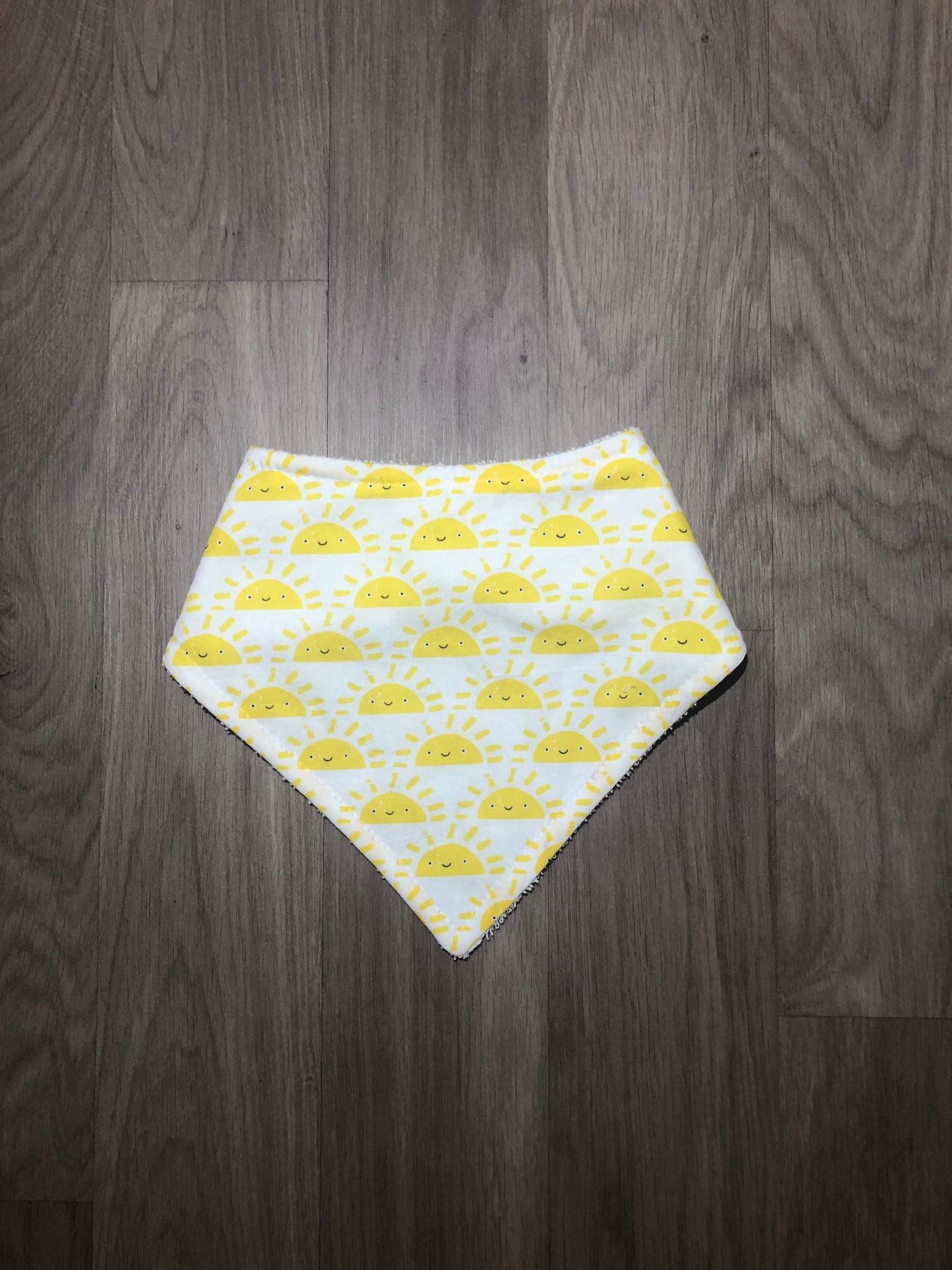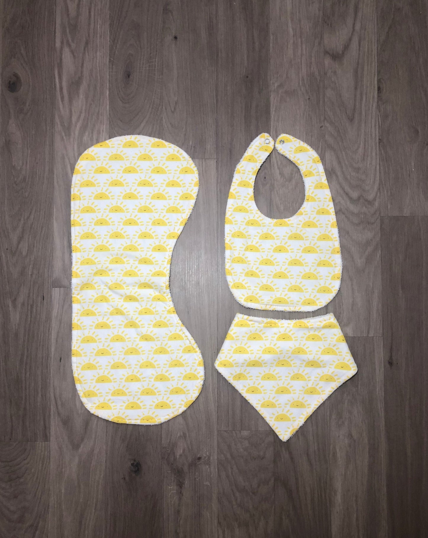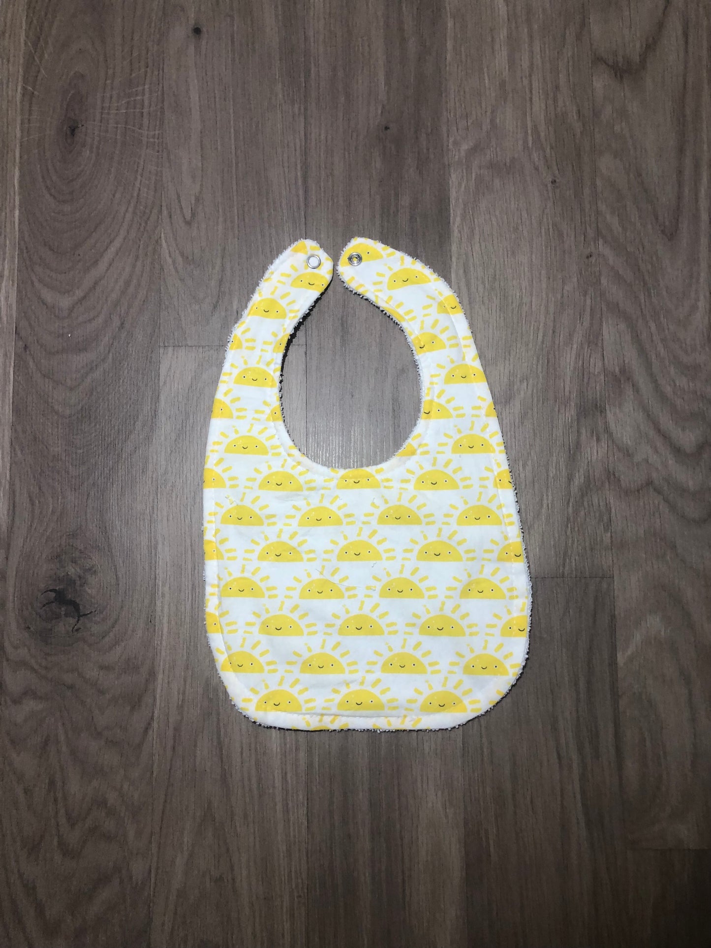 These beautiful bibs and burp cloths are handmade with cotton on the front and absorbent toweling on the back.