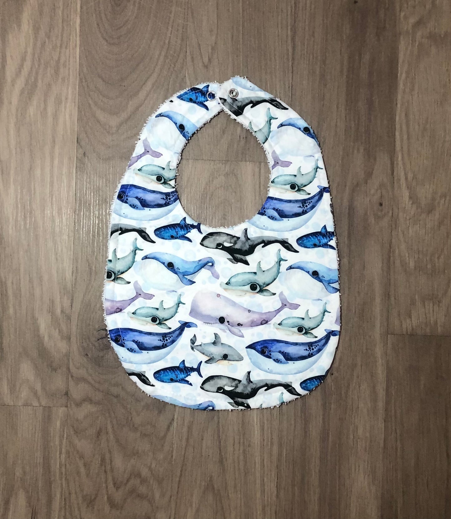 Our beautiful bibs and burp cloths are handmade with cotton on the front and absorbent toweling on the back.